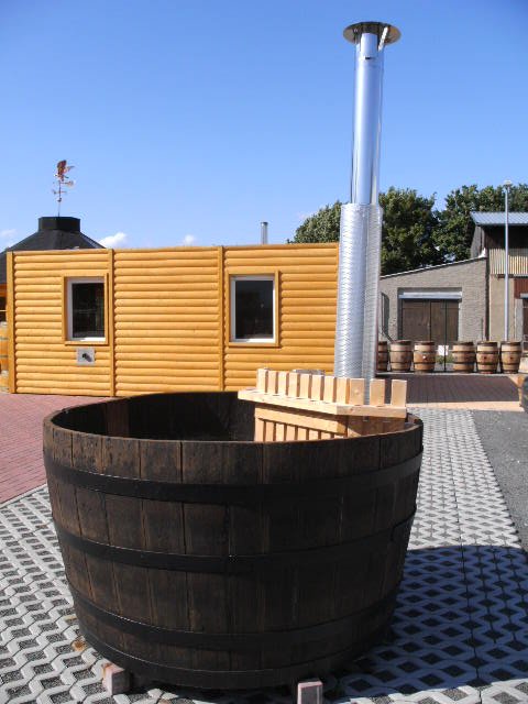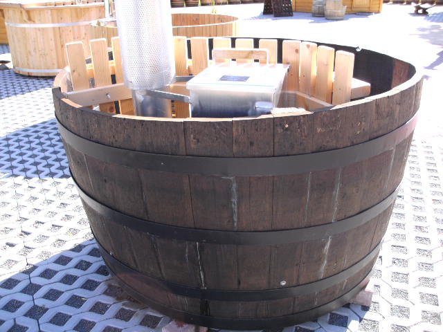 Ovales Badefass - auch HOT TUB genannt Model GF190x120-DELUXE aus großen gebrauchten Eichenholzfasshälfte von Außen fertig geschliffen und poliert und mit UV-Schutzlasur für die lange Lebensdauer aufgearbeitet.