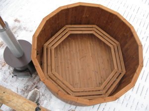Neues Badefass inkl. Holzofen, ein Badevergnügen für 6-8 Personen zu jeder Jahreszeit. Das honigfarbene Thermowood-Holz verleiht eine warme Optik, ist witterungsbeständig und sehr pflegeleicht (kein Anstrich erforderlich).
