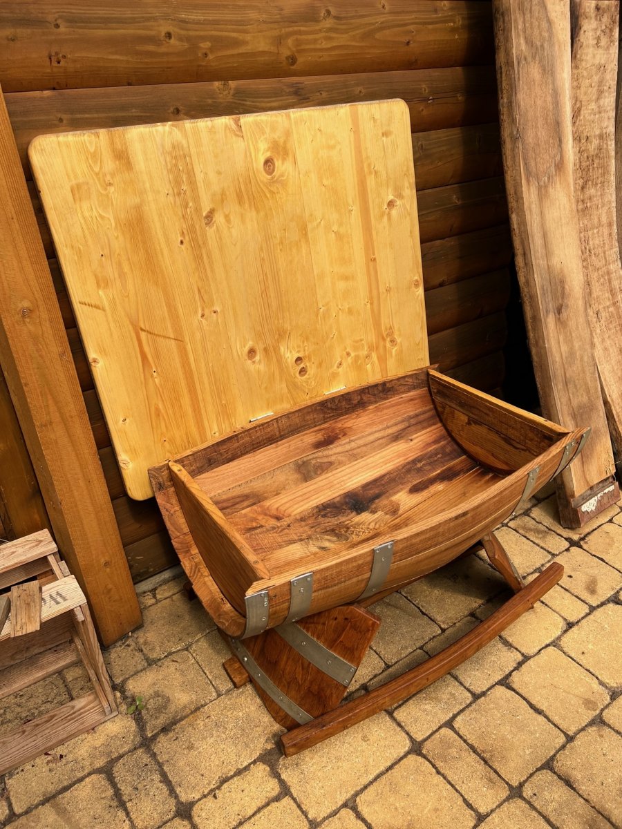 Exklusiver Halbfasstisch aus einer 75 Liter neuen Fasshälfte aus massivem Kastanienholz mit fixierten verzinkten Ringen für die Langlebigkeit.