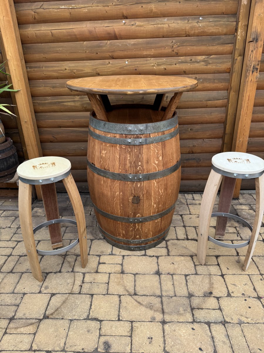 Exklusiver Fasstisch-Gruppeaus einem 225 Liter-Fasstisch aus original Barriquefass aus massivem Eichenholz und4 Stück passenden wunderschönen Fass-Barhocker - M7