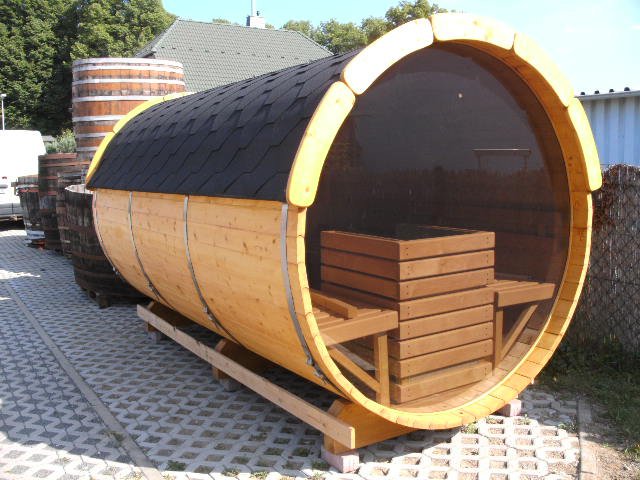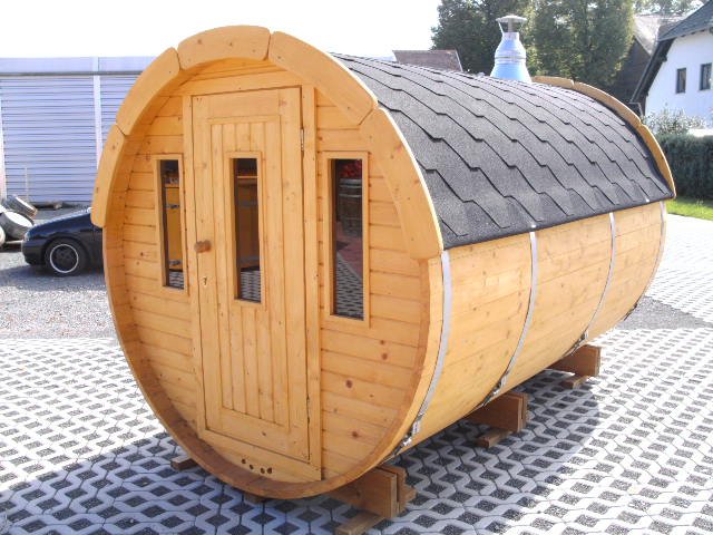 Saunafass, ein Saunavergnügen für 6 – 8 Personen, Außen-Ø 1,9 m (mit Dachblende ca. 2,05 m), Gesamthöhe inkl. 3 Lagerböcke ca. 2,1 m, Außenlänge 3,5 m, massives, unbehandeltes Fichtenholz, mit und ohne Außenterrasse