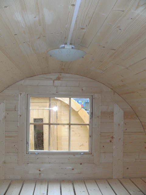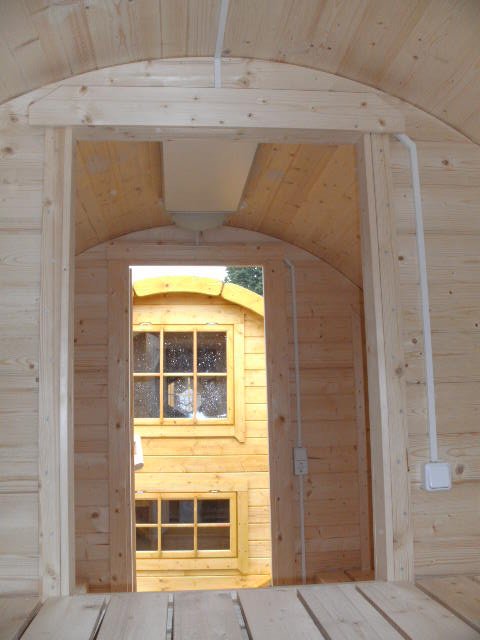 - Elektropaket: (besonders empfohlen für den gewerblichen Einsatz) 1 Stk. Infrarotheizung max. 500 W, 2 Deckenleuchten, 2 Ausschalter mit Steckdose, 1 Ausschalter für IR-Heizung, Verteilerdosen, Kabelkanal (alles Aufputz), Mantelleitung NYM, 1 Stk. Rauchmelder (Batteriebetrieb) inkl. im Fass erfolgter Elektroinstallation, ohne externen Anschlusskasten und Sicherung (Leitungsschutzautomat), kundenseitige Realisierung nötig +1.000,00 ¤
