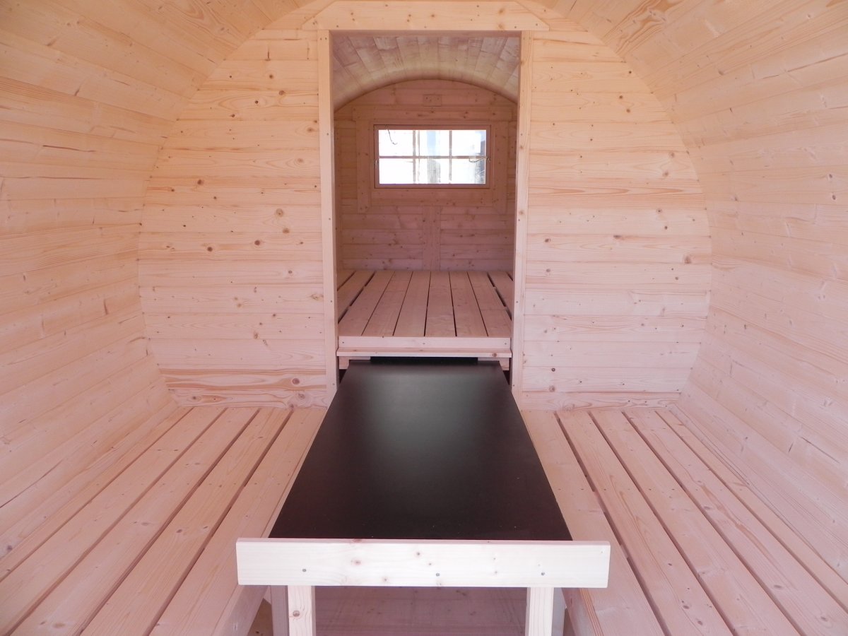 ein Übernachtungsvergnügen für 2 Personen + 2 Kindern, Außen-Ø 2,2 m (mit Dachblende ca. 2,35 m), Gesamthöhe inkl. 4 Lagerböcke ca. 2,4 m, Außenlänge 4,4 m, massives, unbehandeltes Fichtenholz, ohne Außenterrasse
